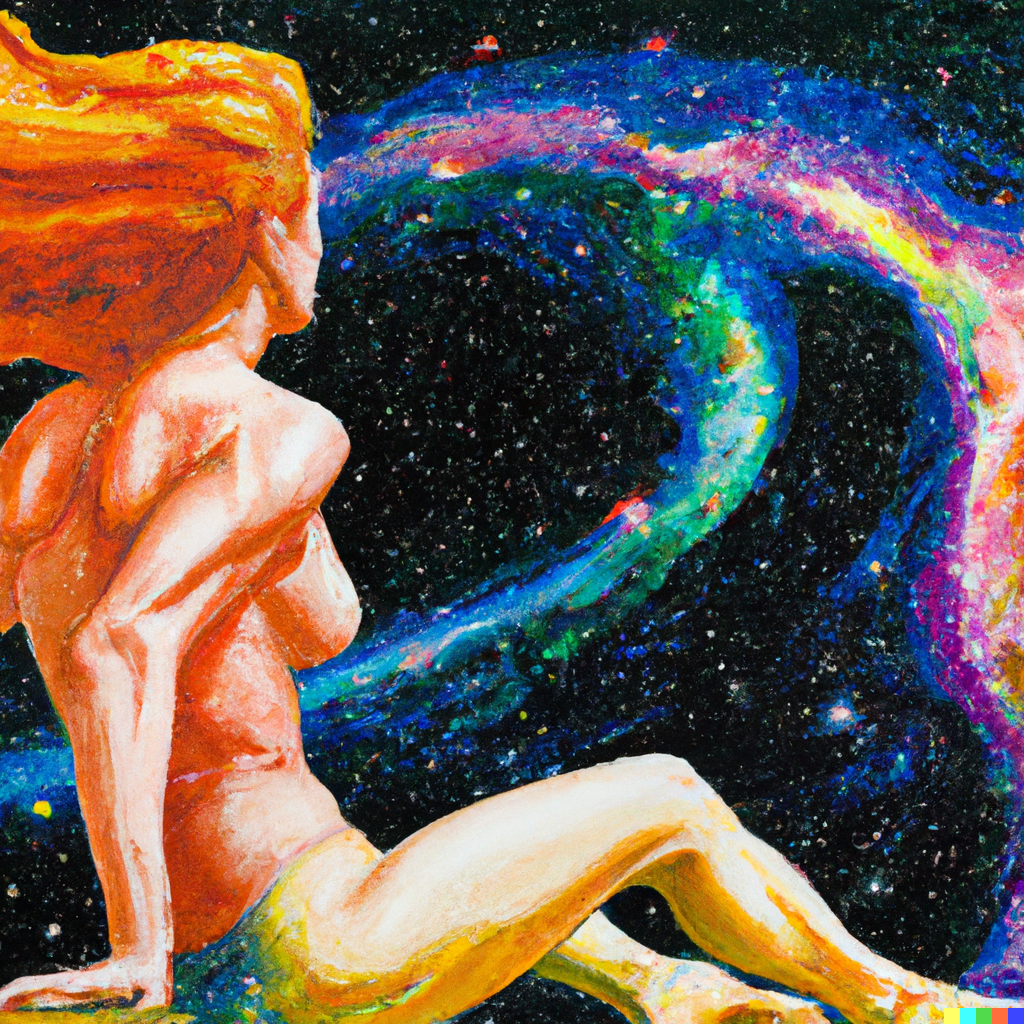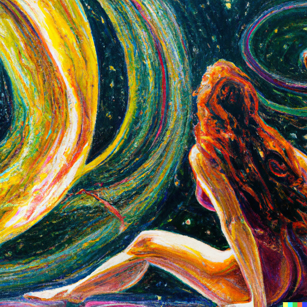 Author’s note: My initial experience of Dall-E. Seeking an image of a sculpturally-based Gina Jane Raynes dreaming of the LaHand Galaxy (a galaxy that did indeed emerge from a dream), I requested thus: