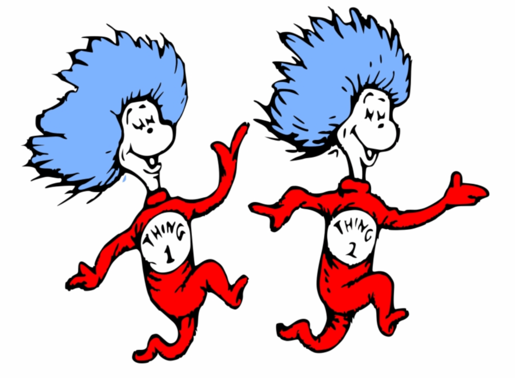 “Right!” I go. “I couldn’t remember their names, I was calling them Thing 1 and Thing 2.”