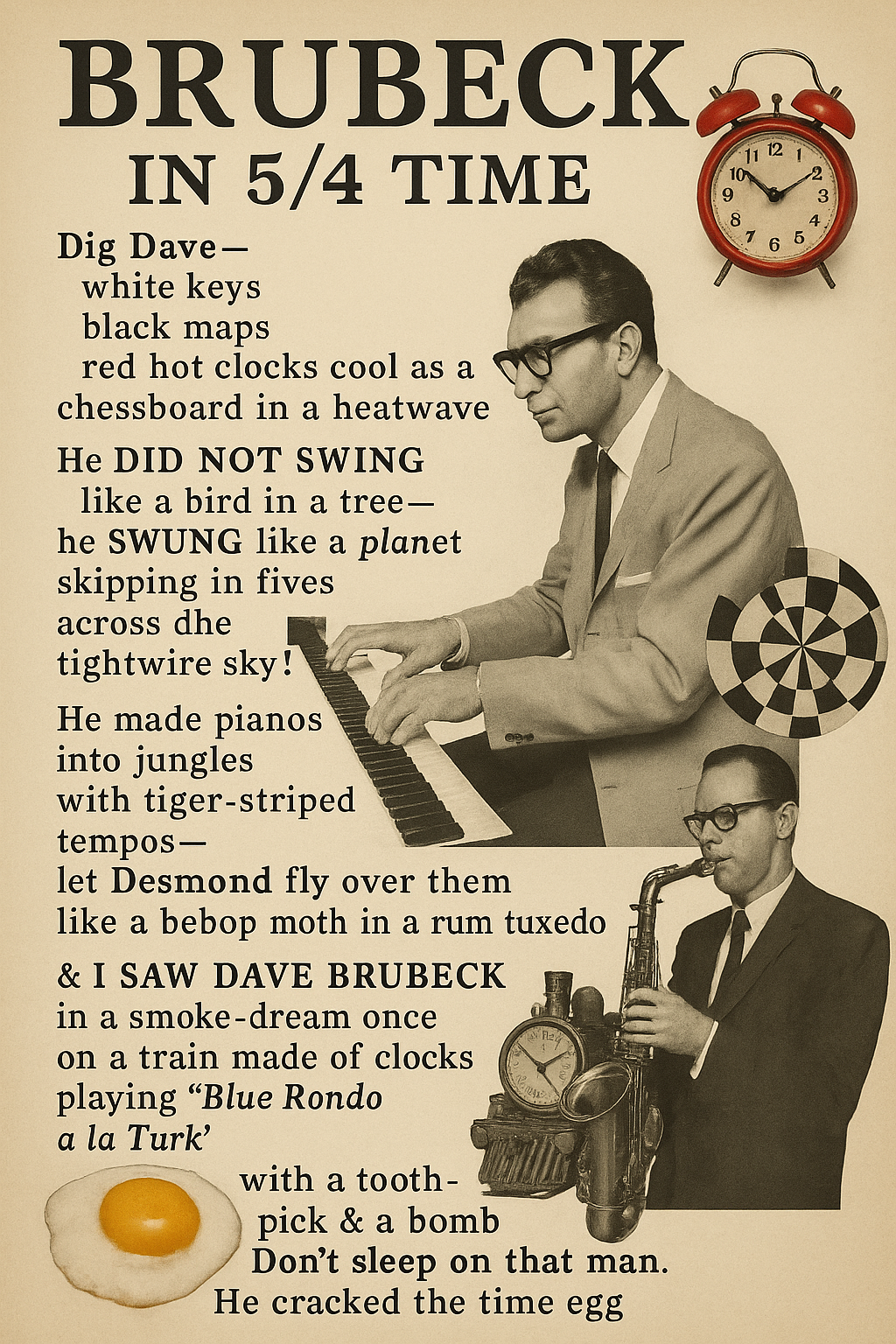 Perhaps Joans was dissing the Amsterdam audience; the camera pans the room quite a bit, and these people look very much like “intellectual” Brubeck fans. But this suggests an interesting Chat experiment: a little détournement is in order. Hey, Chat, how about a short poem about the greatness of Dave Brubeck in the style of Ted Joans? To my surprise, Chat spits out a pretty good poem by Joans standards, and of course follows it up with a collaged version.