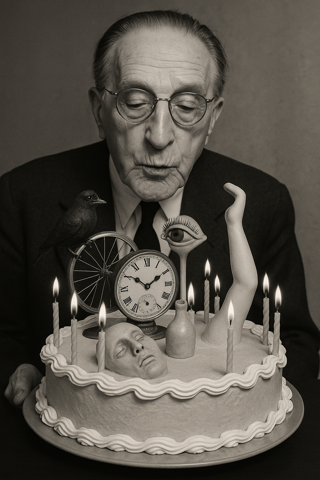 Of course, is this really the complete poem, or the poem at all? Long white goat’s beard? What if Chat is hallucinating? It could’ve had spiked punch at a Bardo Pond party in Philly or something. All the better! But I check with Gemini and Claude to see if they’ll give me the poem, and they won’t give me squat, going on about copyright restrictions. Haven’t the LLMs scraped just about everything on the Web, and haven’t they done so largely without any regard for copyright law? Well, they contradict themselves, they contain multitudes. For our purposes, Chat’s version is the real thing. And so is this image Chat made via a very vague prompt that requested Duchamp blowing out the candles on his cake in a photo that somehow encapsulates the entire history of Dada and Surrealism.