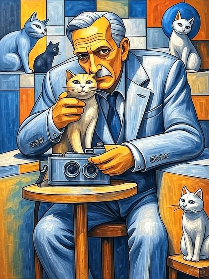 What’s with the cats? Was Duchamp known as a cat lover? Not as far as I know. Gemini agrees. There’s apparently a 1913 photo where he’s posing with his brothers, and the photo includes Jacques Villon’s dog, named Pipe. (Cue the Magritte jokes.) And that’s it. But Gemini is wrong. The photo in question is on the Duchamp Research Portal where the brothers are posing with the dog and two cats. I don’t bother pointing this out, because Gemini is already fed up: “In general, discussions about Duchamp’s life and work tend to focus on his intellectual pursuits, his relationships with other artists and patrons, and his revolutionary ideas about art, rather than his domestic life with animals.” Touché!
