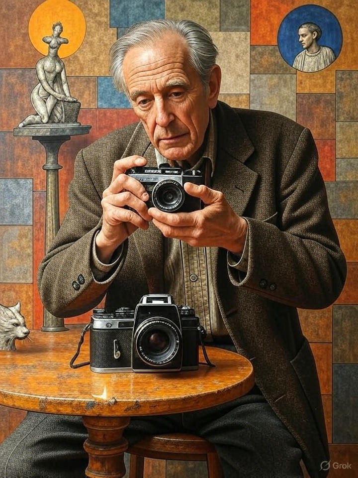 First off, it’s not a photo like the previous image, it’s a painting. Or maybe a poster or a lithograph. There’s a chessboard in a clear nod to Duchamp, but that’s a wagon wheel, not a bicycle wheel. Gemini says he never used a wagon wheel. Perhaps the wagon wheel is some kind of wry commentary on the bicycle wheel. The pioneer spirit? And perhaps Dada is the left side, Surrealism the right, a clear bifurcation? I don’t want to ask Chat anything about how it made this particular image. I don’t want to make it, um, self-conscious. I ask Gemini if the rose has any significance in the history of Dada, and apparently it doesn’t. Could Chat be so subtle as to reference Rrose Sélavy here? Maybe. Or Samy Rosenstock? Who knows. The key is Chat sees it perhaps from Duchamp’s POV as he apparently looks upon, or perhaps paints, a still-life with an ambiguously overwrought collaged background. “Took a picture” is open to interpretation. This turns out to be ingenious, because Meta (left) and Grok (right) don’t see it that way, much to their chagrin, if they were capable of chagrin.