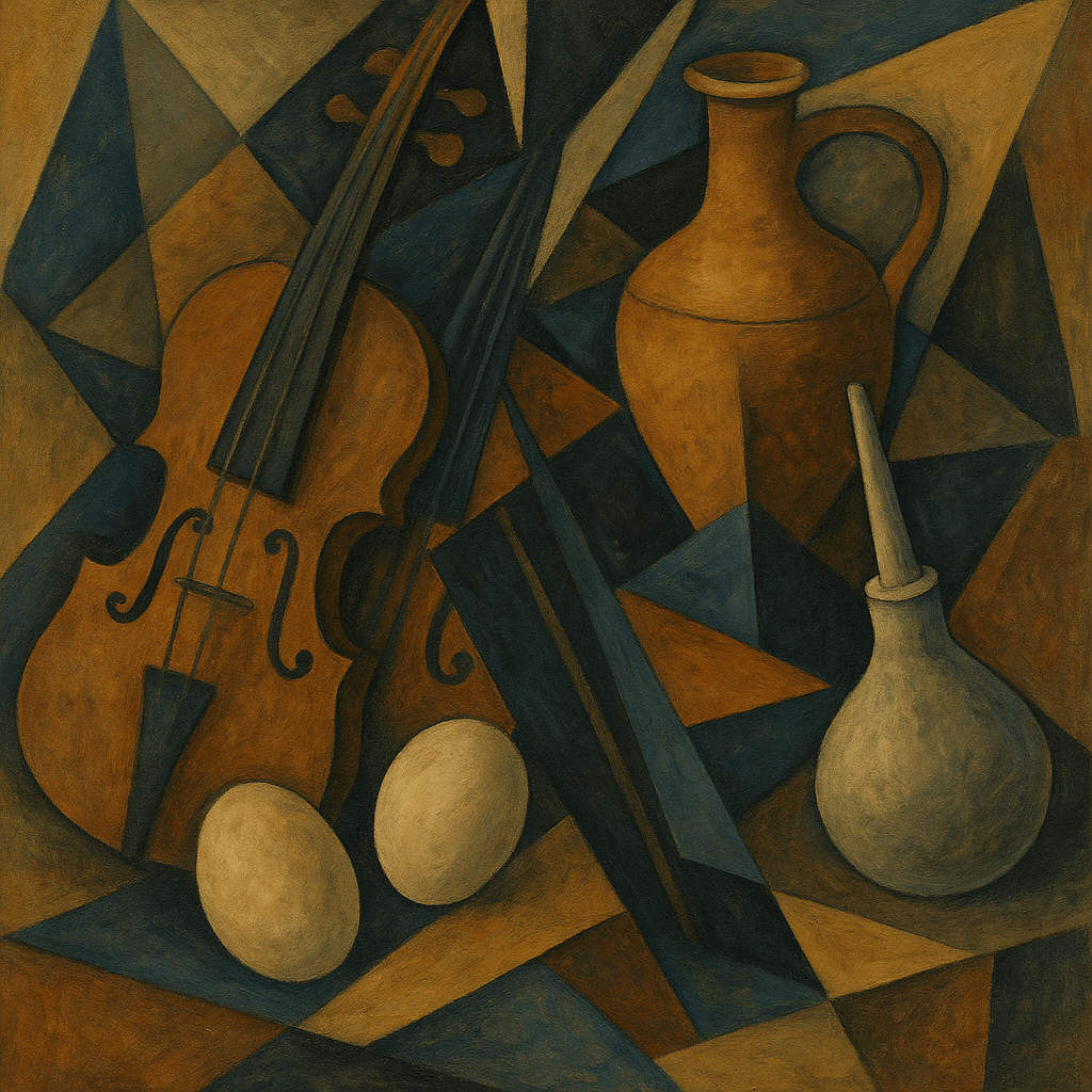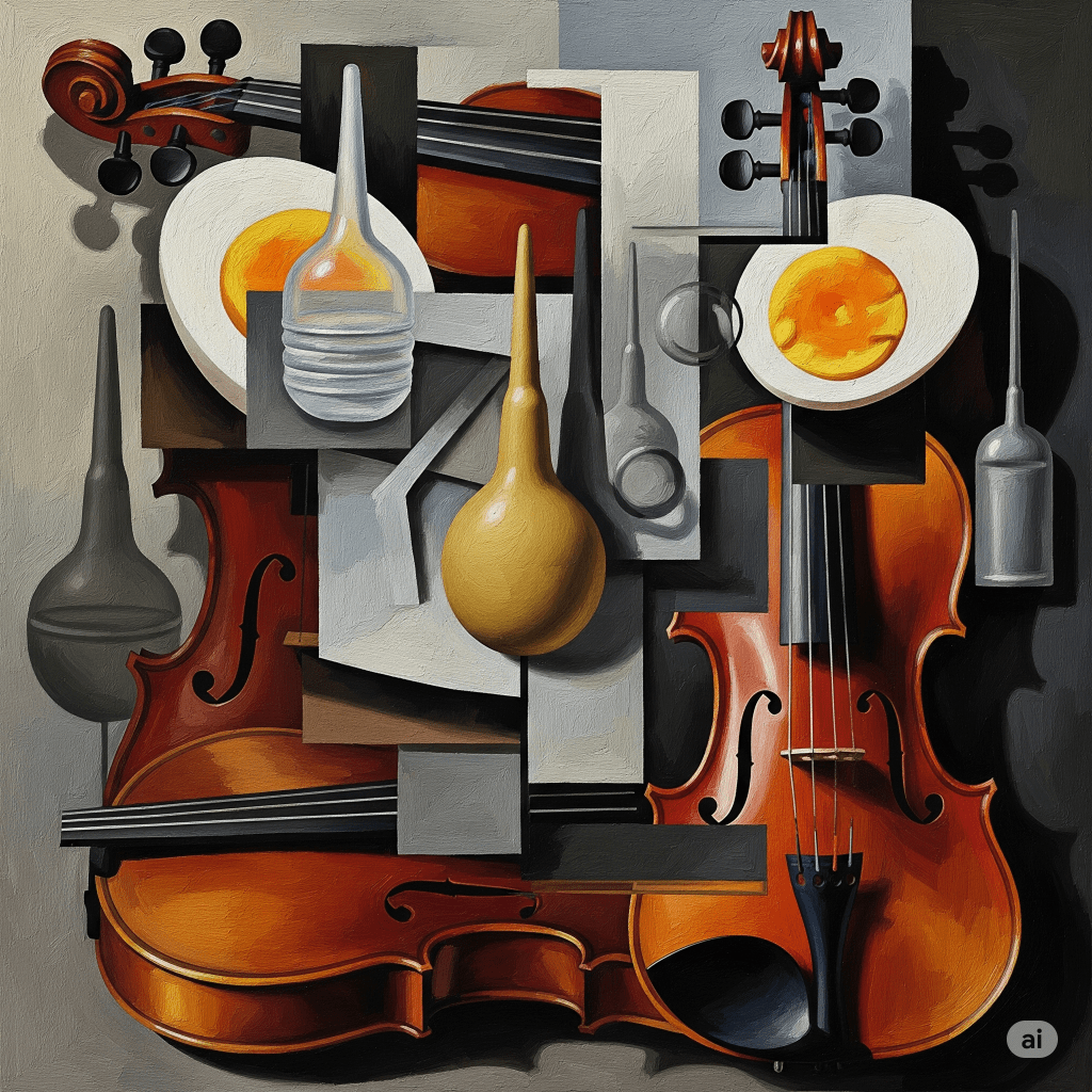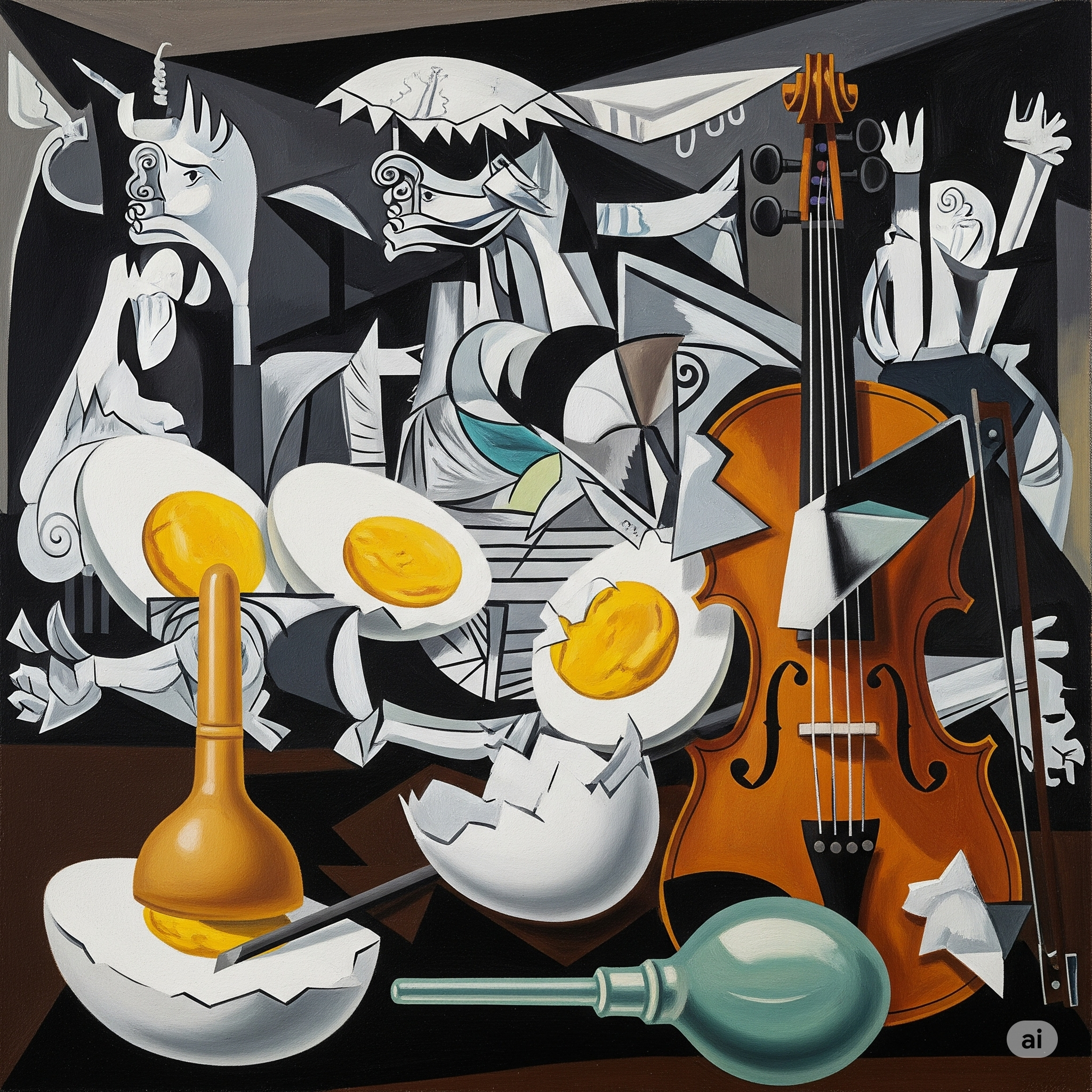 So what would the image generators make of this? The line, not the poem. The poem may be the prompt, but here the line is the prompt, with a little nudge. I asked premium Chat and Gemini to elucidate the line, sans text, in a cubist manner, just to be perverse. As Chat notes, the Surrealists were not, as a rule, enamored of the “formalism and rationality” of the Cubists, Picasso excepted. The original line yielded something rather dignified and no more than mildly cubist from Chat (left), while Gemini missed the cubist aspect entirely and insisted on getting down and dirty with the egg. Generic enema bulbs are the order of the day, as one might expect.