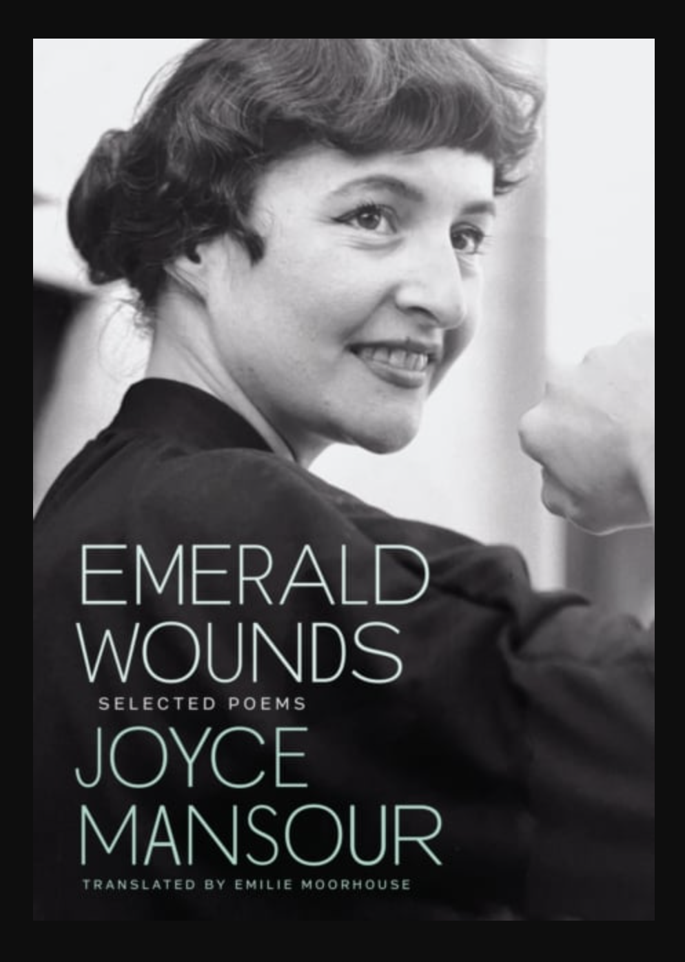 So I’m poking around in the bilingual digital edition of Joyce Mansour’s Emerald Wounds: Selected Poems, translated by Emilie Moorhouse, who notes that Mansour “was known within Surrealist circles because André Breton was a champion of her work, but beyond those circles, she was ignored. Her use of irony mixed with the erotic macabre shares similarities with the work of much more renowned French poets: She is a Baudelaire minus the shame or a George Bataille au feminin.” High praise, indeed.