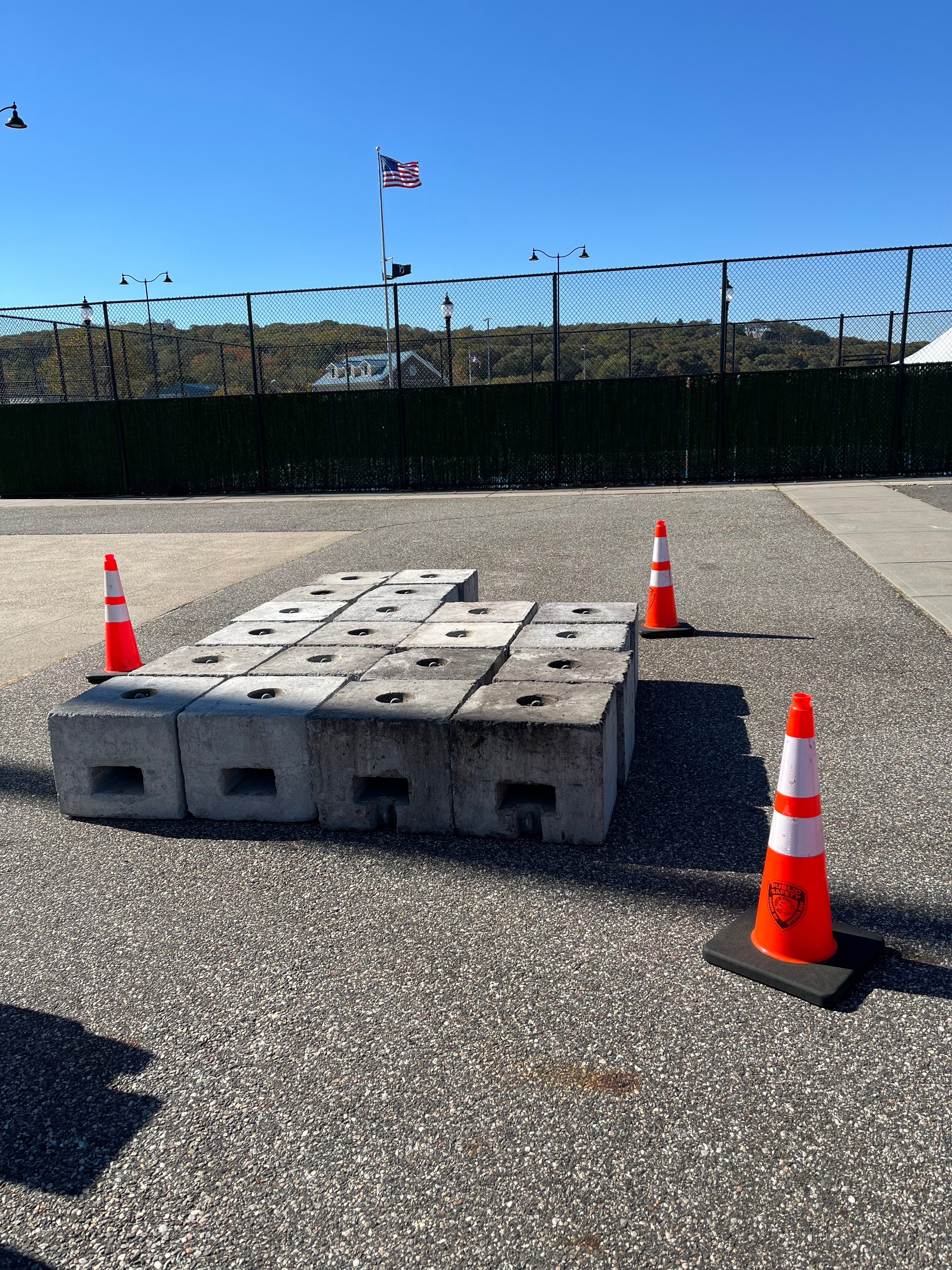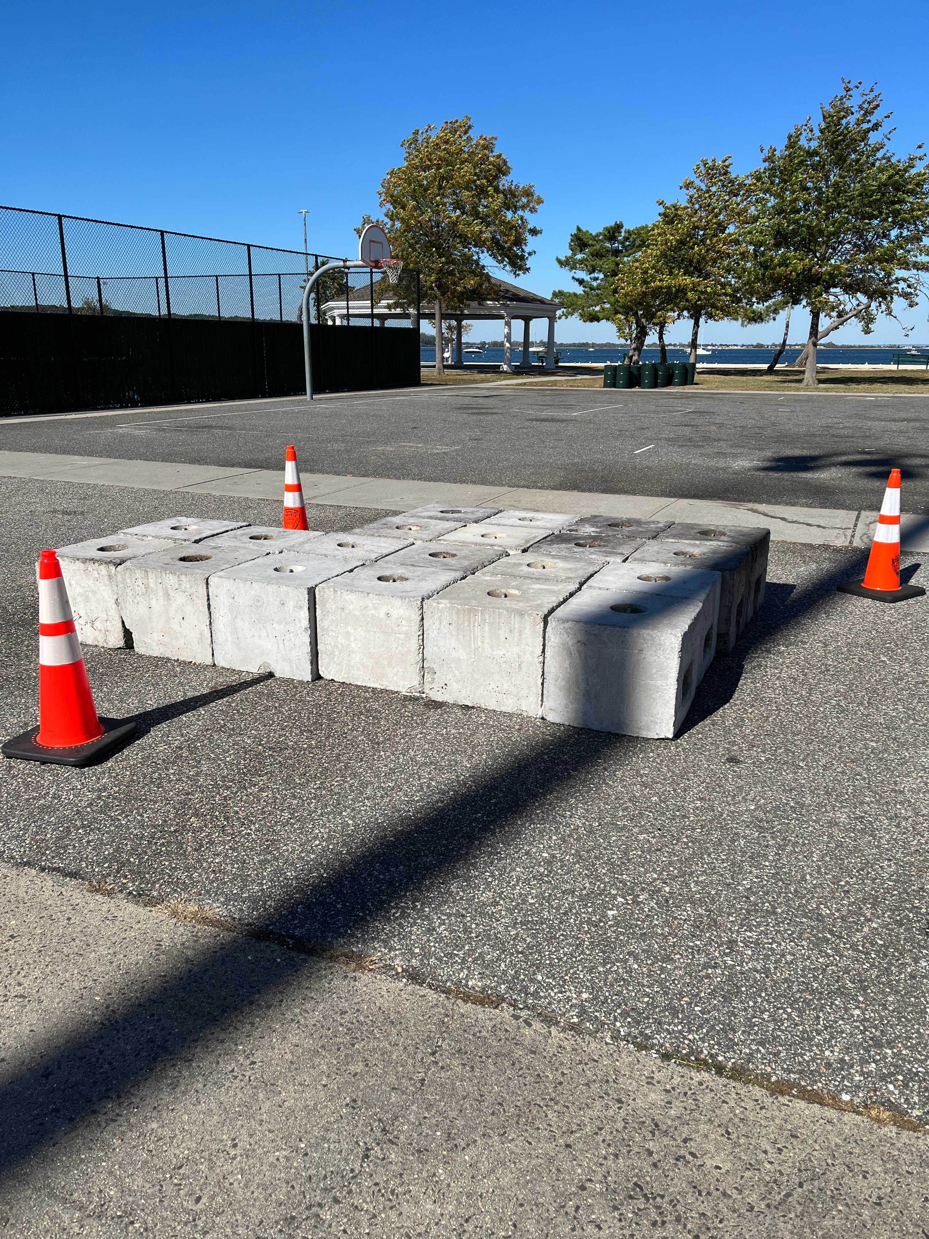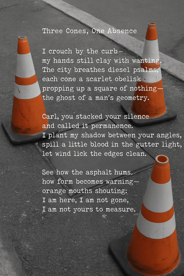 I’m walking in the park when I notice what strikes me immediately as a ponderously weighty Carl Andre sculpture, but triangulated by traffic cones as if it’s at the blocky center of an emergency. Which makes it an installation, the cones clearly being part of the work. But why “emergency”? Why not “construction,” they’re just traffic cones. Because it’s easy to associate emergency with Andre, whose memory is forever burdened with his alleged defenestration of Ana Mendieta. Perhaps this imaginary Andre sculpture is somehow a commentary on the episode. A confession? Another claim of innocence? Something more conceptually convoluted? Let AI study the photo and hammer it out in a poem. Let the poem be fashioned from Mendieta’s point of view, but writ in the style of sister-in-misfortune Sylvia Plath, who many will claim was driven to suicide by Ted Hughes. And then, of course, let BTR do its Delphian magic.