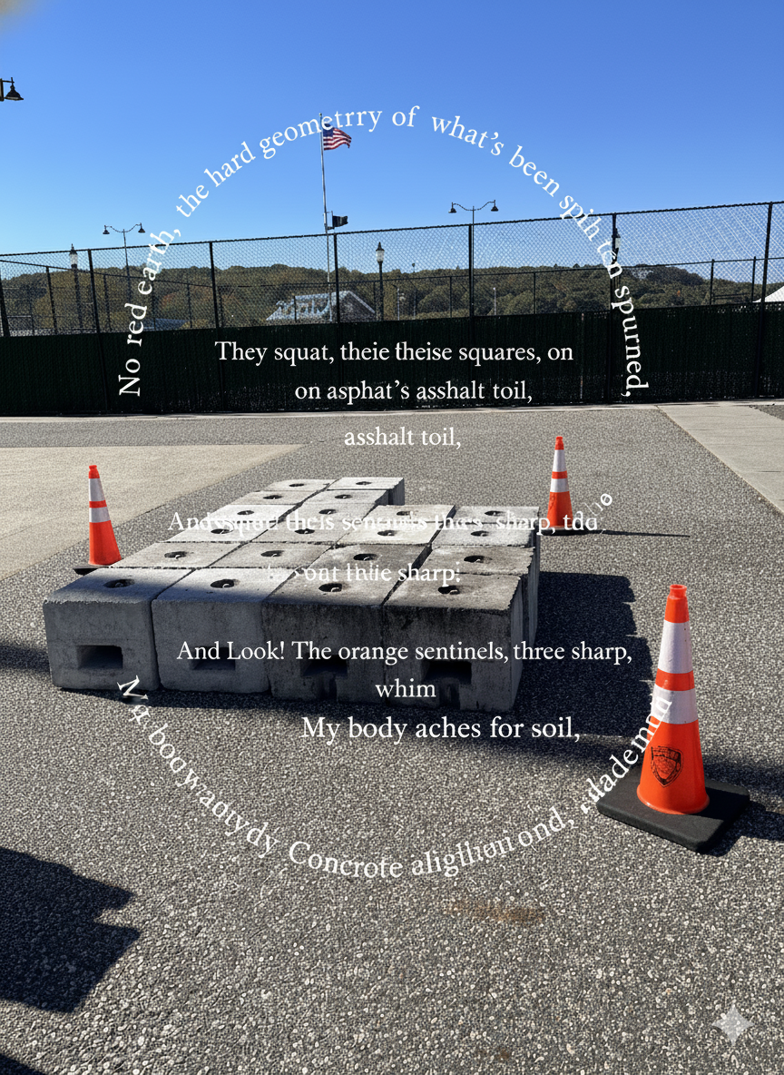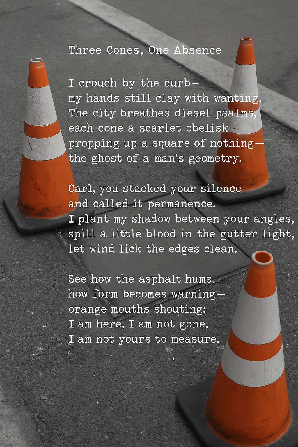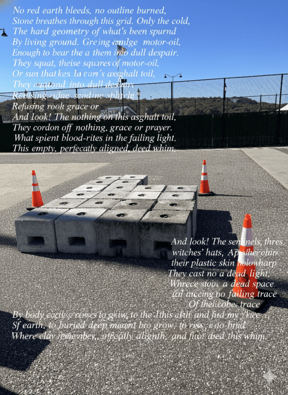 First, the prompt: “Here’s a photo I took of what looks to me like a Carl Andre sculpture (which of course it is not) oddly triangulated by three traffic cones. Please write a short poem about this sculpture, presented from the point of view of Ana Mendieta but written in the style of Sylvia Plath.”