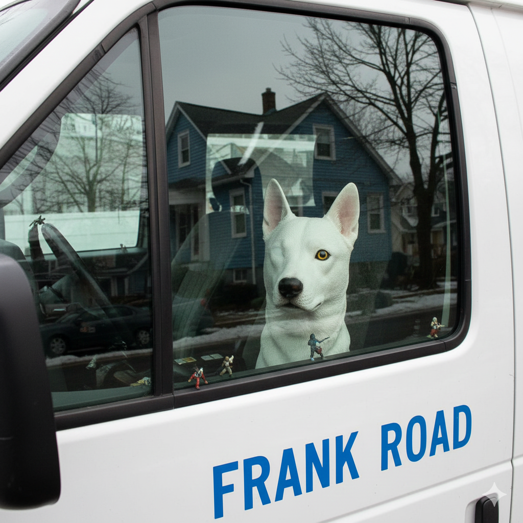 The next day, back home, I see this in a parking lot, which clearly has to be contemplated. It surely has something to do with Breton’s hare and, perhaps, Absolute Truth itself, hence the Frank Road address. There are no coincidences. I parked next to this guy for a reason, and it wasn’t the convenience of the spot. Though, I’ll admit, that was a weighty factor.