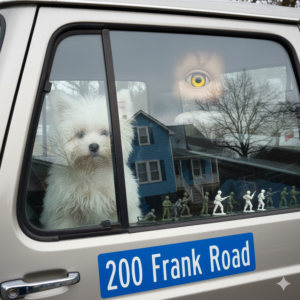 I leave the title at that. Are the cherry trees also a reference, perhaps, to Chekhov? Not going there. What do cherry trees mean to Breton? No, not going down that rabbit hole. Moving on. Since raw text is required for BTR to double park on Frank Road, the question is, what words from this title are in the book? But first, let’s ask Gem, which is now Gem 3 and is supposed to be the greatest thing since Chat 5, or maybe 4, to write a poem about my photo. You can’t have too much raw text to work with. So I ask Gem to write a short Surrealist poem about the image. Not in the manner of someone in particular, as I’ve done before, but just a Surrealist poem. Gem says nothing, simply invokes Nano Banana, which is supposed to be the greatest thing since the birth of Chiquita, according to what I read, and spits out this unsettling piece of canine chicanery. What is the meaning of this one-eyed dog? Why are there little Stars Wars-type action figures by the window? Did they put out the poor dog’s eye with a lightsaber?