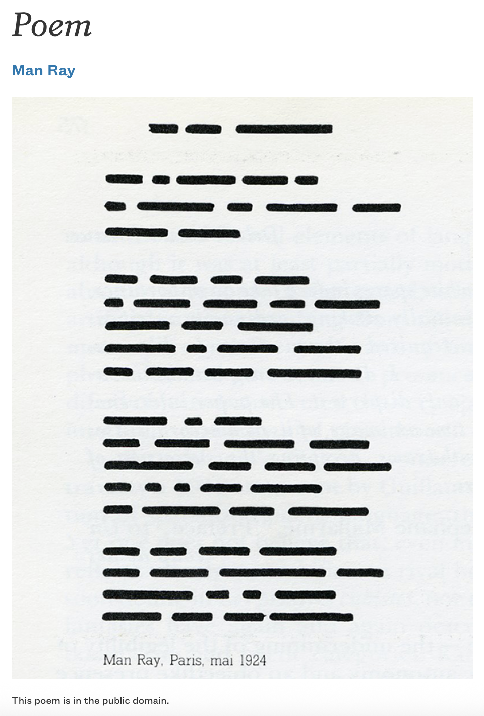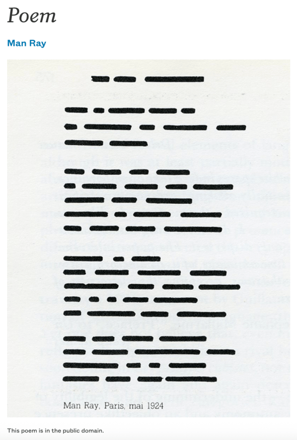 Uh, yeah. But wait! Speaking of conceptual stillness, there’s a piece of Man Ray’s poetry—if you can call it that—online that seems to the contemporary (squinting) eye to be a completely redacted text, right out of the Epstein files the way the DOJ would do them if they could. Chat claims this “dash poem” is under copyright, hence not reproducible, but it isn’t. Let’s just view Chat as a dreaming object having a literary infringement nightmare. Here it is: