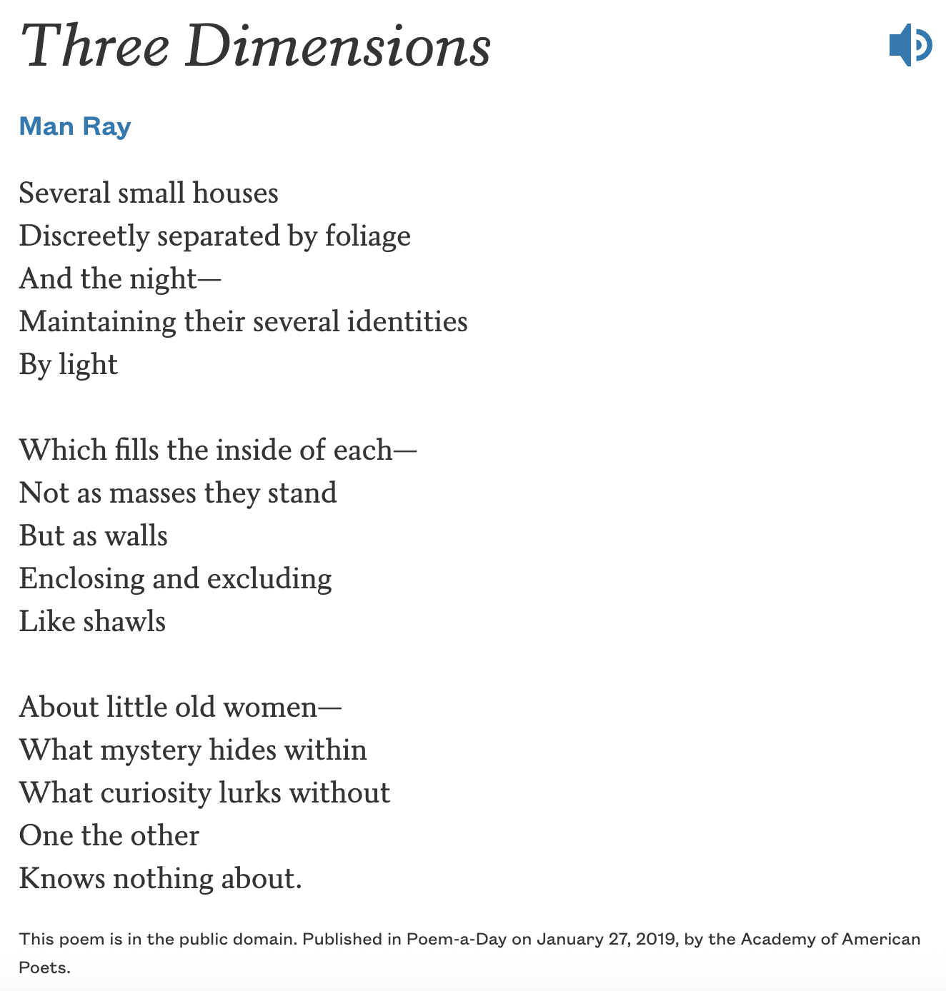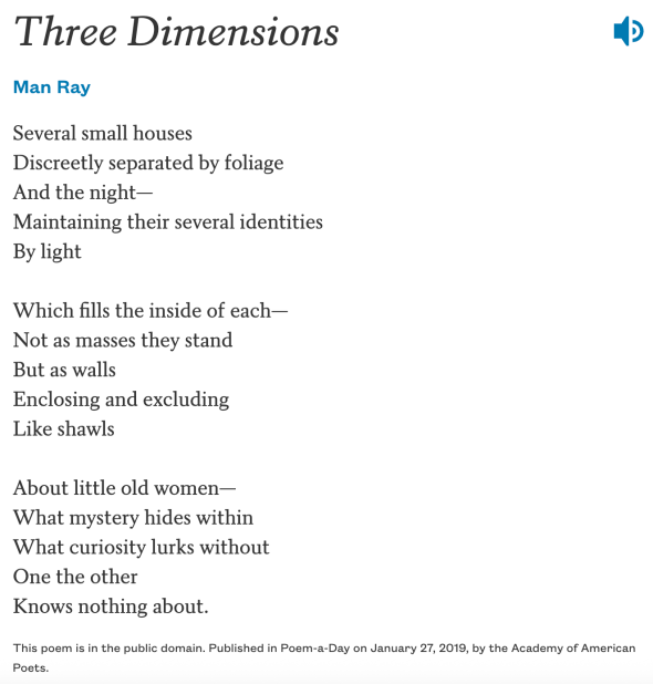 Well, yeah, they can be—in some respects, we’re a long way from what was visually exciting in the 1920s—but we’re concerned here not with oneiric eggbeaters but with Man Ray’s poetry, assuming he has any. And he does! For example, I discover this little tidbit online.