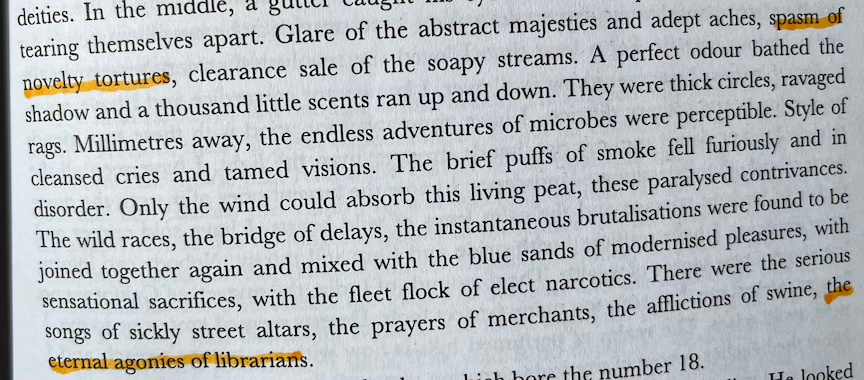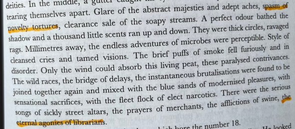 You know that this evening there’s a green crime to be committed. Open wide that door, and tell yourself that now it’s completely dark, that day has died for the last time. A man comes back to life for the second time. Spasm of novelty tortures, the eternal agonies of librarians.