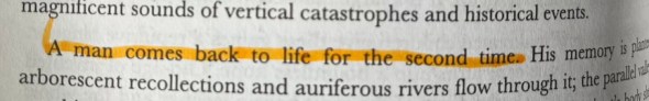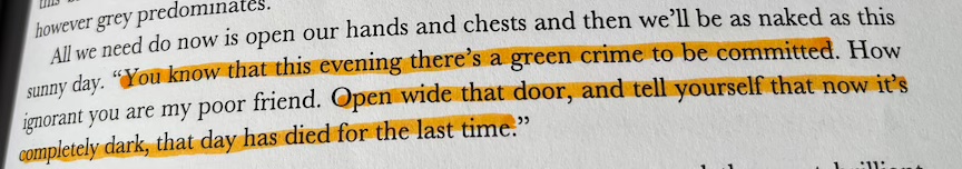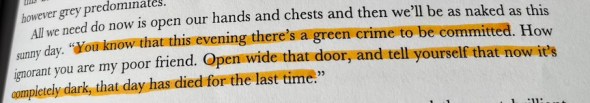 As for the first highlighted text itself: “You know that this evening there’s a green crime to be committed. Open wide that door, and tell yourself that now it’s completely dark, that day has died for the last time.” The ecological implications of this are plain, unless you’re in the fossil fuel business. But why leave unmarked the line sandwiched between these lines, “How ignorant you are my poor friend,” naked and alone? Some things will remain mysterious.